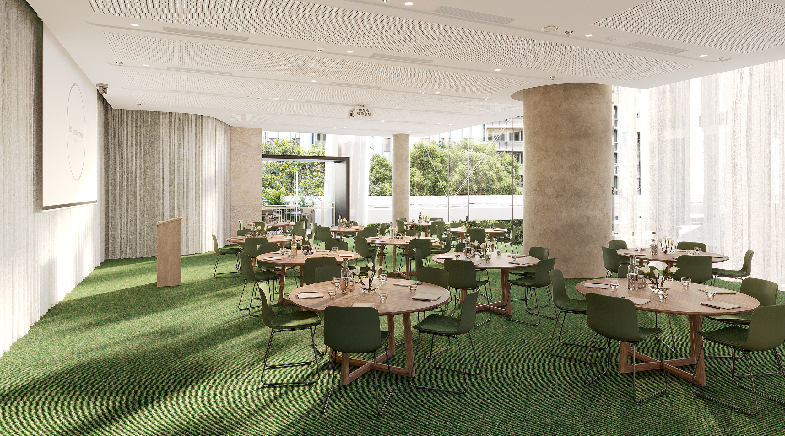 360 Queen Street Pavilion Hub provides connected, multifunctional spaces including a 100-person conference centre (theatre mode) a connected outdoor terrace, tech enabled boardroom and informal meeting spaces.